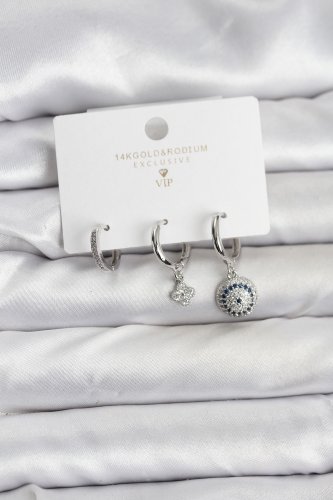Nazar Model Gümüş Renk Pirinç 3lü Kadın Küpe Seti