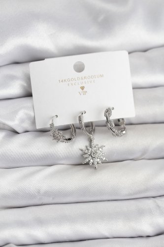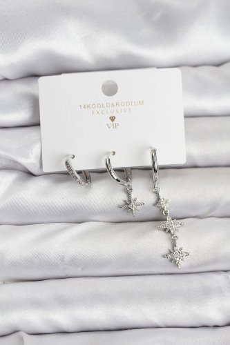 Pirinç Gümüş Renk Kutup Yıldızı Model 3lü Kadın Küpe Seti