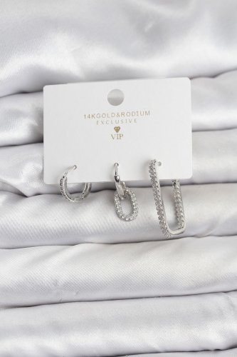 Gümüş Renk Zirkon Taşlı 3lü Kadın Küpe Seti