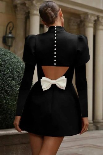 Kadın uzun kollu yarı balıkçı yaka arkadan kurdela detaylı mini atlas elbise
