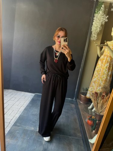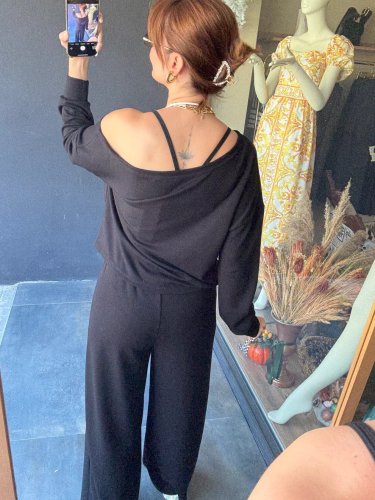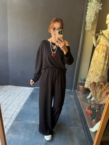 • Kadın uzun kollu tek omuzdan açık viskon iki iplik bluz ve pantolon ikili takım