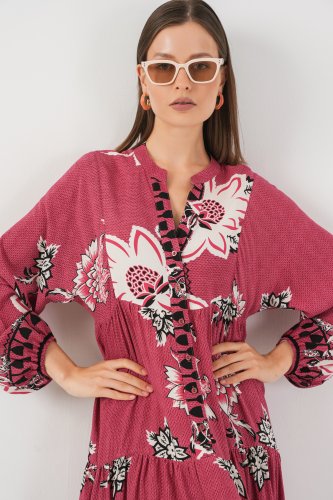• Desenli Uzun Tesettür Elbise 2585 Gül Kurusu