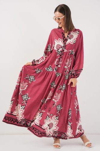 Desenli Uzun Tesettür Elbise 2585 Gül Kurusu