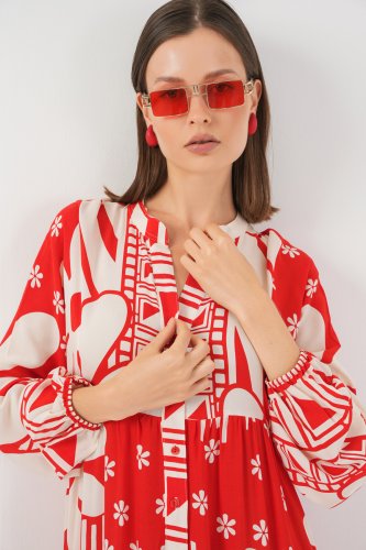 • Desenli Uzun Tesettür Elbise 2585 N Kırmızı