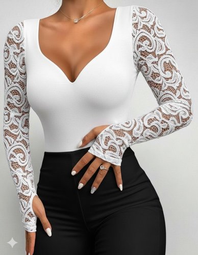 • Kadın uzun kollu dantelli dekolte detaylı dalgıç bluz