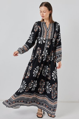 • Desenli Uzun Tesettür Elbise 2585 ASiyah