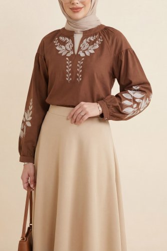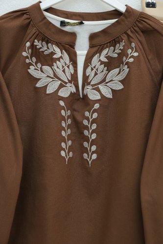 • V Yaka Önü Ve Kolları Nakışlı Keten Bluz Taba