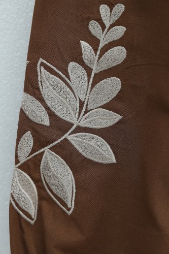 V Yaka Önü Ve Kolları Nakışlı Keten Bluz Taba