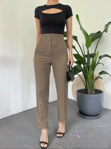 Kadın yüksek bel bağcıklı desenli iki iplik pantolon