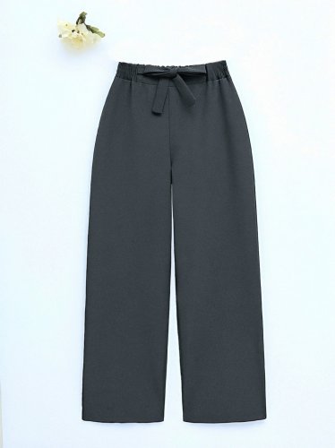 Duble Kumaş Beli Kuşaklı Bol Paça Pantolon Füme